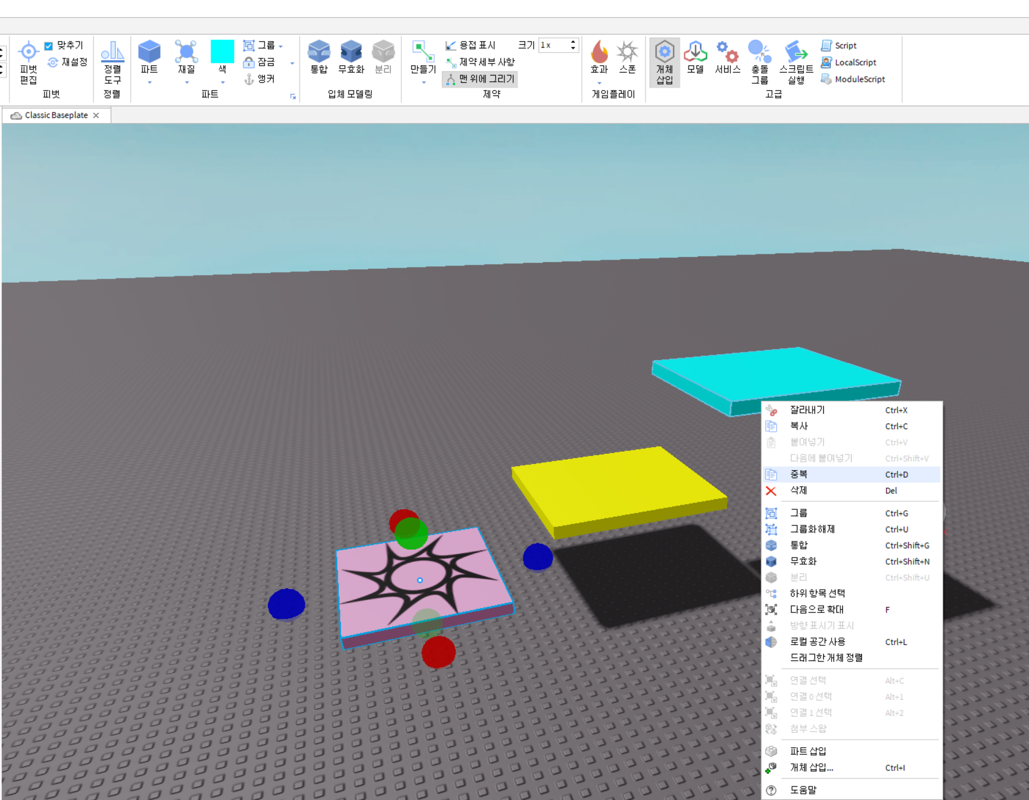 파트를 계속 같은 종류로 연속으로 붙이고 싶어서, 블럭 위에 오른쪽 마우스 클릭을 해서 > 중복 > 이동을 반복으로 하여 주었다.