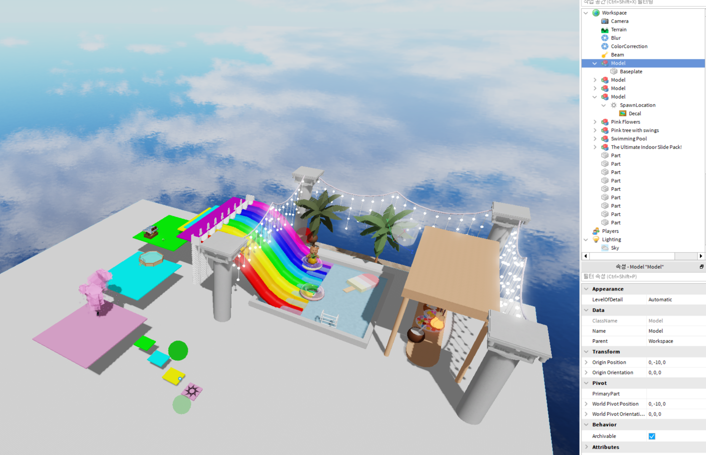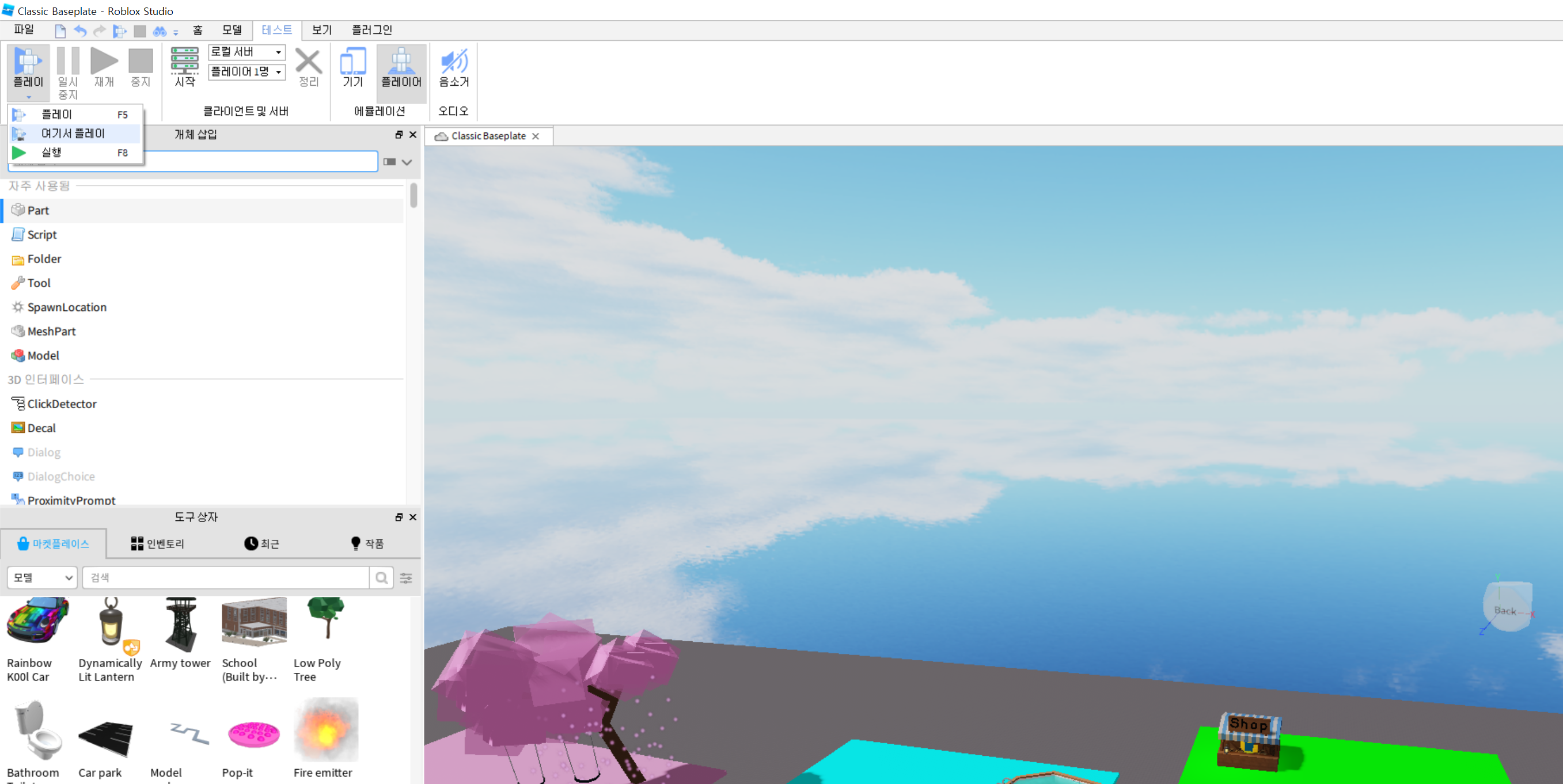 로블록스에 로그인해서 > 만들기 > 로블록스 스튜디오 가 새롭게 깔려지는데, > 새로 만들기 > 지형 중에 Classic Baseplate 을 열어서 > 스폰 파트를 만들고 > 도구 도 넣어서 > 로블록스에 공개 게시해 보았다.